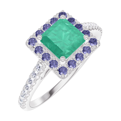 « L'ATELIER » NO. 170951Ring White gold 18 carats - Emerald Princess 0.5 Carats - Halo Blue Sapphire - Setting Diamond white 4.1