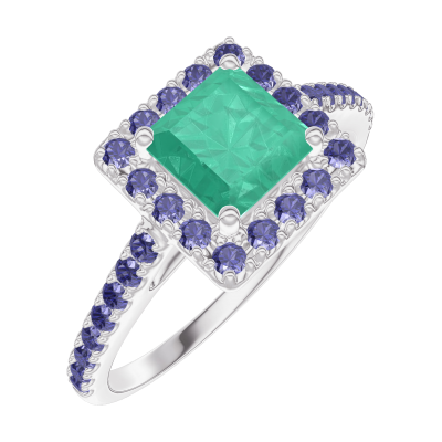 « L'ATELIER » NO. 170959Ring White gold 18 carats - Emerald Princess 0.5 Carats - Halo Blue Sapphire - Setting Blue Sapphire 4.1