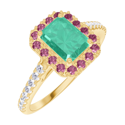 « L'ATELIER » NO. 170981Ring Yellow gold 18 carats - Emerald Baguette 0.5 Carats - Halo Ruby - Setting Diamond white 4.7