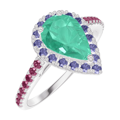 « L'ATELIER » Nº171100Ring White gold 9 carats - Emerald Pear 0.5 Carats - Halo Blue Sapphire - Setting Ruby 4.8