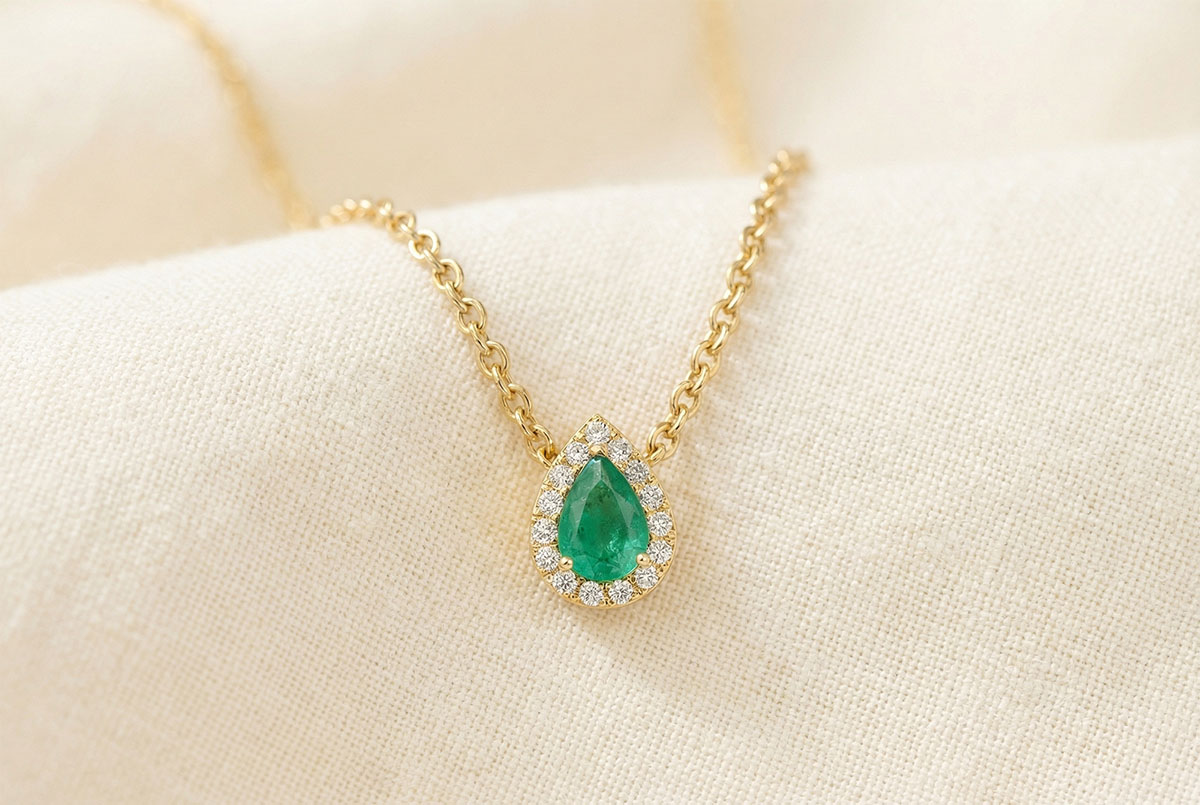« L'ATELIER » NO. 202345Necklace Yellow gold 18 carats - Emerald Pear 0.3 Carats - Halo Diamond white - Chain Rolo