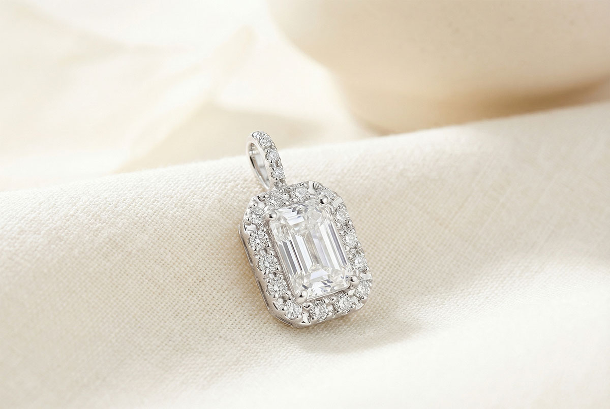 « L'ATELIER » NO. 202839Pendant White gold 18 carats - Diamond white Baguette 0.3 Carats - Halo Diamond white - Setting Diamond white - No Chain