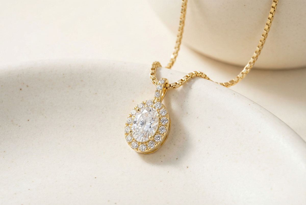 « L'ATELIER » NO. 203062Pendant Yellow gold 9 carats - Diamond white Oval 0.3 Carats - Halo Diamond white - Setting Diamond white - Chain Venetian
