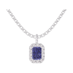 Pendant White gold 18 carats - Blue Sapphire Baguette 0.3 Carats - Halo Diamond white - Setting Diamond white - Chain Venetian