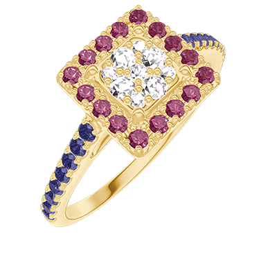 « L'ATELIER » NO. 211477Ring Yellow gold 18 carats - Cluster of natural diamonds Princess equivalent 0.5 - Halo Ruby - Setting Blue Sapphire 4.1