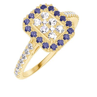 « L'ATELIER » Nº211534Ring Yellow gold 9 carats - Cluster of natural diamonds Baguette equivalent 0.5 - Halo Blue Sapphire - Setting Diamond white 4.7 (43)