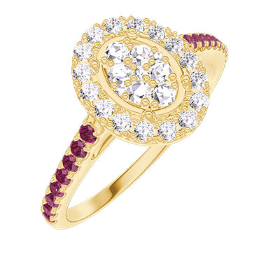 « L'ATELIER » Nº211554Ring Yellow gold 9 carats - Cluster of natural diamonds Oval equivalent 0.5 - Halo Diamond white - Setting Ruby 4.5