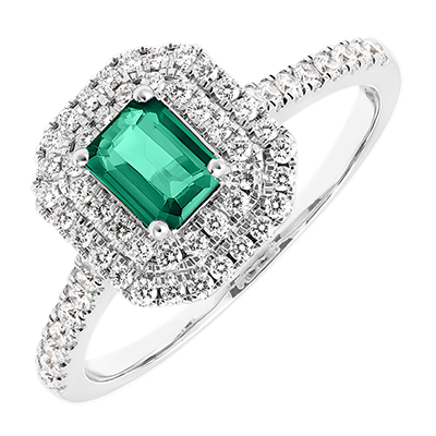 « L'ATELIER » NO. 405960Ring White gold 9 carats - Emerald Baguette 0.5 Carats - Halo Diamond white - Setting Diamond white