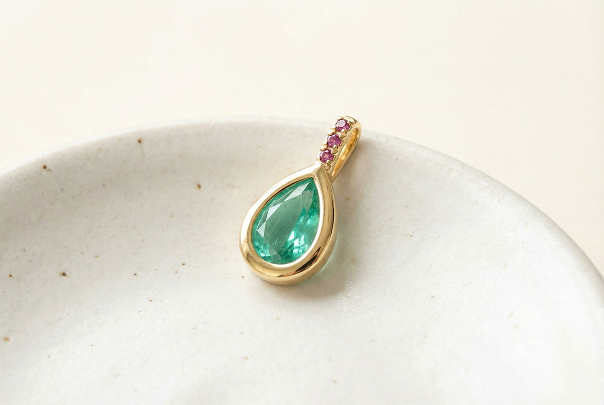 « L'ATELIER » NO. 408584Pendant Yellow gold 18 carats - Emerald Pear 0.3 Carats - Setting Ruby - No Chain 4.4