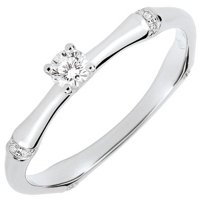 A strong and supple kind of bamboo which is fashioned into yellow gold eternal engagement ring. The nodes of the bamboo are encrusted with diamonds in yellow gold to highlight the diamond solitaire. Central stone 0.09 carats. 13 diamonds : 0.13 carat - White gold (18K Gold = 750/-): 1.9 g. More dimensions