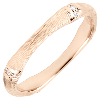 A strong and supple kind of bamboo which is fashioned into a brushed pink gold diamond set eternal ring. The finishing work. done entirely by hand. gives it a natural photo realistic look. 12 diamonds : 0.06 carat - Pink gold (18K Gold = 750/-): 2.8 g. More dimensions