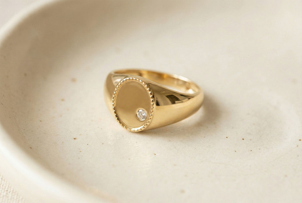 An oval signet ring with a delicately chased edge set with a sparkling diamond. A resolutely modern piece of jewellery.