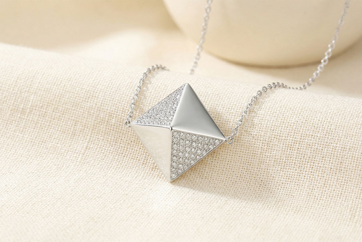 The octahedron shape of the rough diamond is available in gold and diamond tilings to honor its raw and original form. Length: 90cm