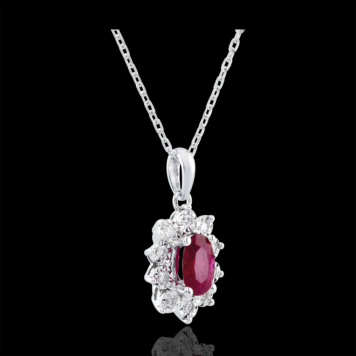 An oval lab-grown ruby is the center of a white gold daisy which petals are made of lab-grown diamonds. With chain 42 cm with 3cm extension in 18K gold. 10 diamonds: 0.08 carat - White gold (18k = 750/1000): 3 g. Ruby: 1 - Total: 0.63 carat - Ruby Dimensions: Length: 6mm - Width: 4mm - Thickness: 3mm With gold chain 750/- . 10 diamonds : 0.08 carat - White gold (18K Gold = 750/-): 2.9 g. Synthetic ruby : 11 - Laboratory Diamond - Total: 0.71 caratMore dimensions