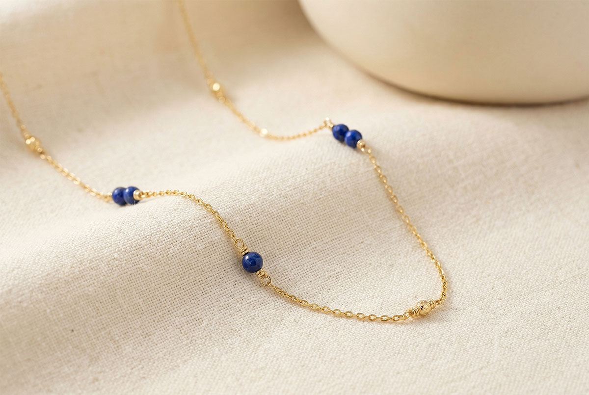 Six deep blue lapis-lazuli beads are delicately set along the chain. Each segment with two beads measures 12.2 mm, while single-bead segments are 9 mm, creating a light, balanced rhythm.A piece of jewellery like a celestial blue constellation—subtle and radiant against your skin.