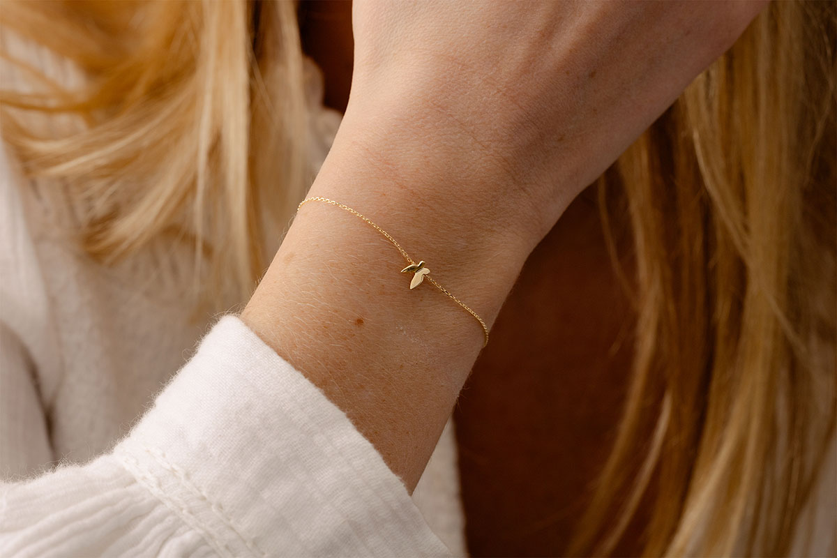 A delicately perched butterfly on your wrist, symbolising freedom and gentleness.A bracelet that exudes grace and lightness – as airy as a summer breeze. Yellow gold (9K Gold = 375/-): 0.4 g. More dimensions