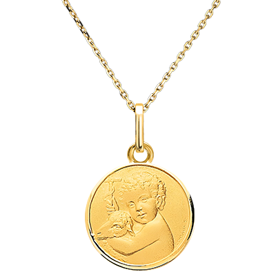 This 18ct yellow gold medal depicts a child tenderly embracing a lamb, symbolising purity, gentleness, and divine protection. Ideal for a christening or birth, this piece evokes unconditional love and celestial blessing, accompanying the child on their spiritual journey. Material: 18ct yellow gold. Diameter: 18 mm. Finish: Sandblasted relief with polished gold edge. Custom engraving available on the back. Delivered in an elegant box, ready to offer as a symbol of gentleness and protection. Without chain. Yellow gold (18K Gold = 750/-): 2.7 g. More dimensions