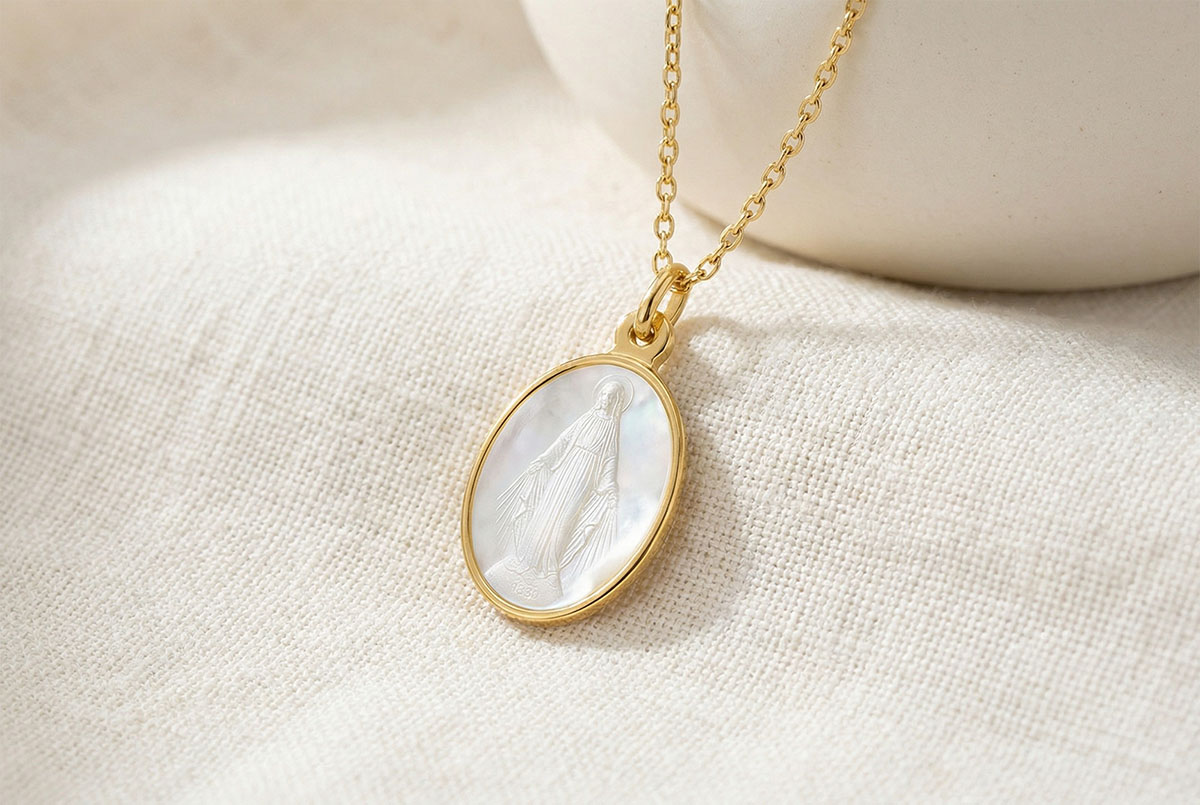 Miraculous Virgin Medal – 18ct Yellow Gold and Mother-of-Pearl