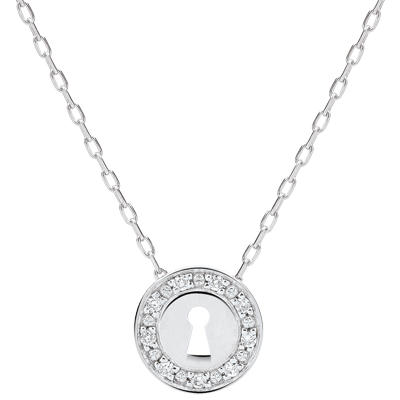 A heart necklace in white gold bearing a lock is mounted on a white gold chain covered with two diamonds.