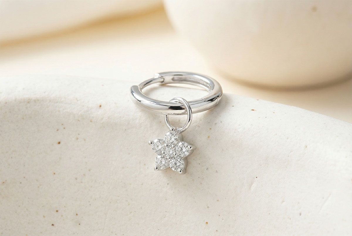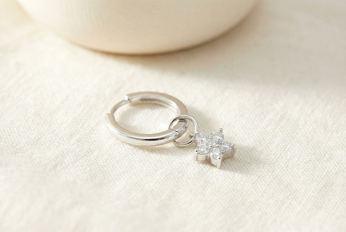 A single white gold hoop earring with a diamond studded star shaped charm. Charm attach dimensions : 3,1m diameter.