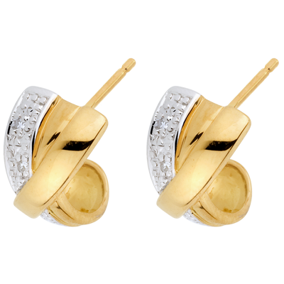 A strip of yellow gold crosses a strip of white gold and diamonds and joins.