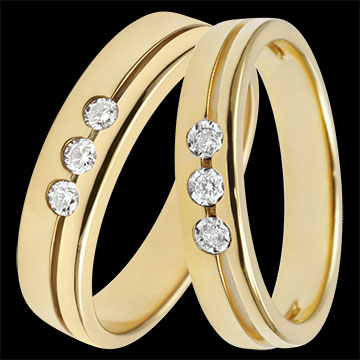 An elegant pair of yellow gold wedding bands adorned with a trilogy of diamonds, celebrating unity and harmony.