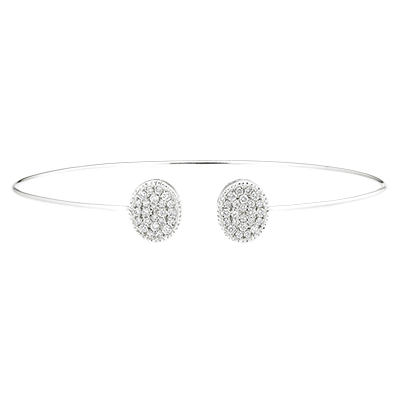 The radiance of two sophisticated diamond-paved ellipses on a delicate white gold bangle bracelet.