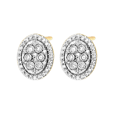 The brilliance of oval pavé diamond earrings, crowned with a diamond halo. A pair of fine and delicate white and yellow gold studs, marked by timeless elegance. 76 diamonds : 0.17 carat - White and Yellow Gold (9K Gold = 375/-): 0.8 g. Cluster of natural diamonds : 76 - Diamond white - Total: 0.165 carat More dimensions