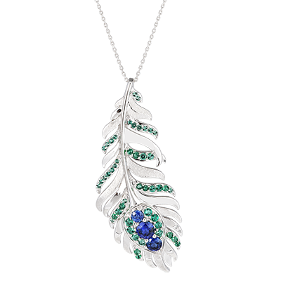 The Altesse necklace in 18-carat white gold stands out with its feather motif adorned with 50 synthetic emeralds and sapphires. With a chain length of 45 cm, this necklace adds a touch of elegance and sophistication to your neckline, reminiscent of the peacock's splendor. With gold chain 750/- . White gold (18K Gold = 750/-): 11.6 g. Synthetic emerald : 47 - Synthetic sapphire : 3 - Total: 1.465 carat More dimensions