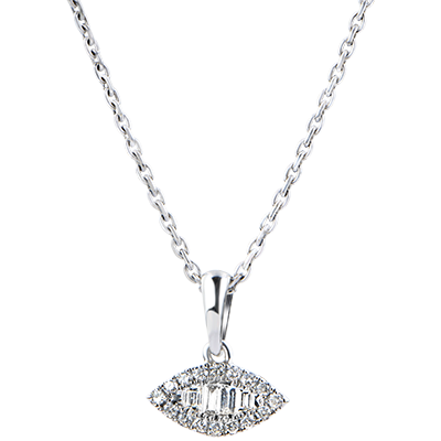 A baguette diamond trilogy, enhanced by an almond-shaped pave setting for a pendant whose shapes are inspired by oriental fairytales.