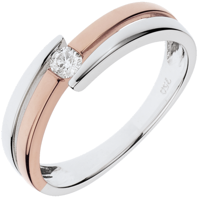 Rings of white and pink gold combine to symetrically encase a solitaire diamond.