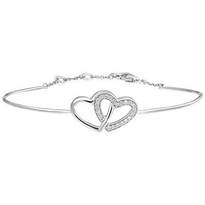 This bangle with a pair of tender and romantically entwined hearts, delicately blends white gold inlaid with diamonds. Bracelet with chain and clasp for everyday wear.