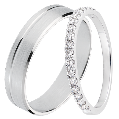 An elegant set of wedding rings for her & him. For her, a semi-pavé band adorned with 18 diamonds totalling 0.26 carat. For him, a brushed band highlighted by striking polished lines. White gold (18K Gold = 750/-): 0 g. More dimensions