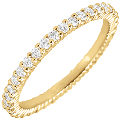This elegant yellow gold wedding band is completely inlaid with 38 exceptional diamonds. This timeless wedding band is the perfect companion for any type of engagement ring or it can be worn on its own. 38 diamonds : 0.57 carat - Yellow gold (18K Gold = 750/-): 2 g. More dimensions