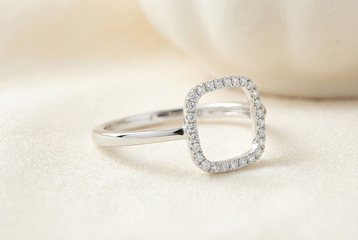 A minimal, geometric ring composed by an essential diamond frame. A light, modern piece reflecting a pure feminity.
