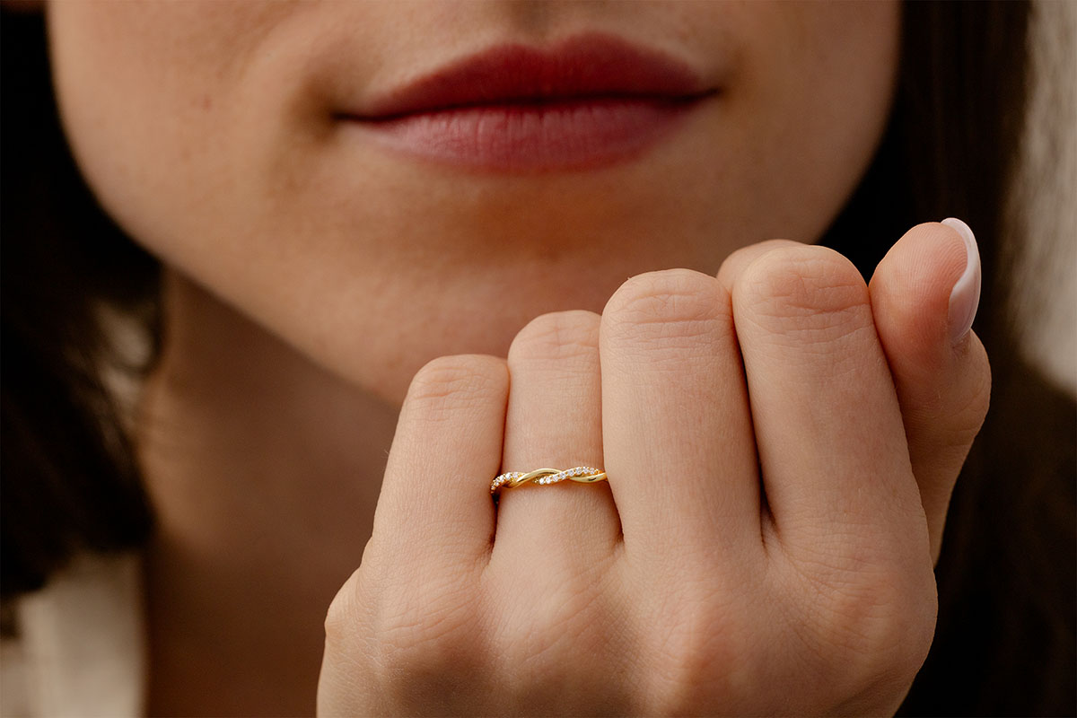 A ring where two golden threads intertwine, yellow gold and yellow gold set with diamonds like an eternal embrace.