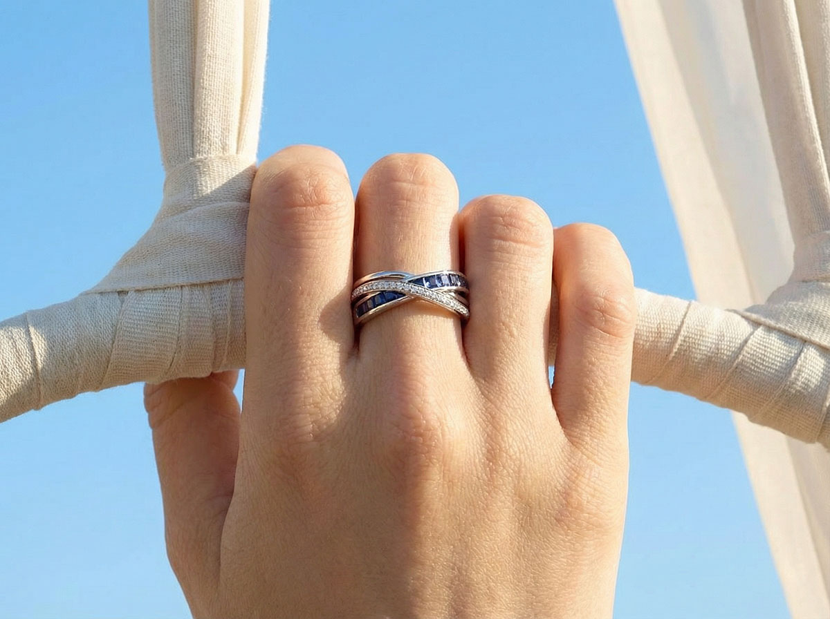 Customers appreciate the ring’s original design and quality stones. The sapphire pavé and diamond sparkle are frequently praised. Some note the sapphires appear darker in reality than in photos, but overall satisfaction with fit and comfort is high.