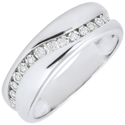 A white gold ring is crossed by a smooth curve on which throne 15 diamonds.