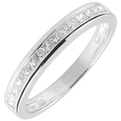 A row of fifteen princess cut diamonds embellishes this wedding ring creating an effect of timeless elegance.