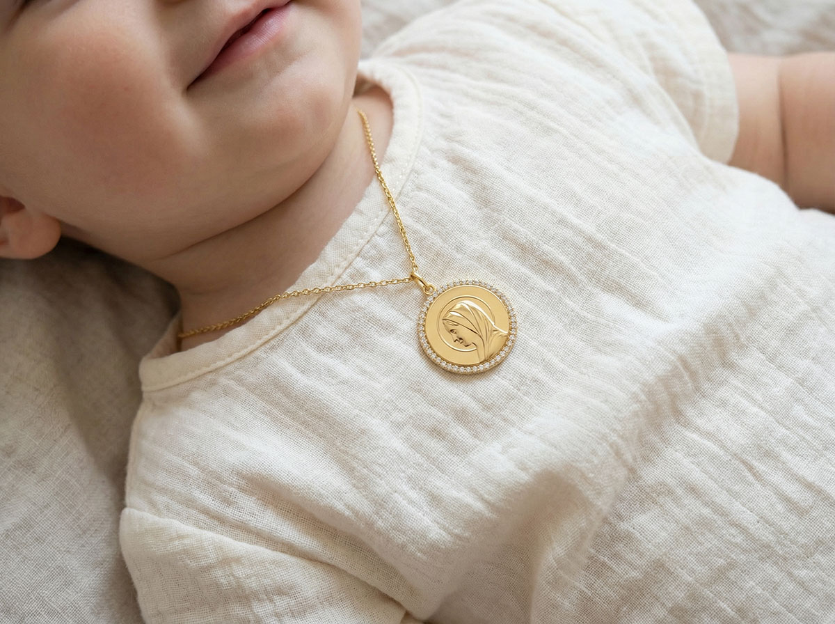 Round Baptism Medal Set with Left-Facing Virgin Mary – 9ct Yellow Gold and Lab-Grown Diamonds