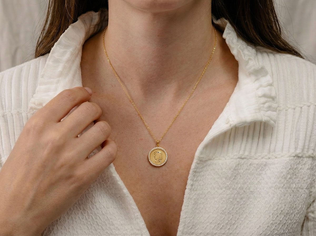 This round medal in 9ct yellow gold features the delicately sculpted left profile of the Virgin Mary in relief, encircled by a subtle setting of lab-grown diamonds that enhances its brilliance and elegance.Diameter: 18 mm - 23.5 mm including bailFinish: Polished yellow goldDelivered in an elegant presentation box, ready for gifting