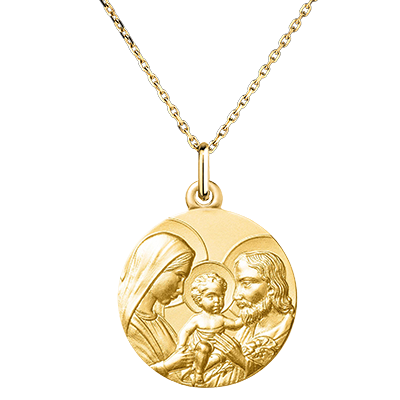 This yellow gold medal portrays the Holy Family, featuring the Virgin Mary, the Child Jesus, and Saint Joseph in a moment of tenderness and harmony. The detailed relief of this emotional scene, where the three sacred figures are united under a halo of light, embodies peace, family love, and divine protection. A piece of great significance, symbolising unity and spiritual love, perfect for celebrating a birth, baptism, or important spiritual occasion. Material: 18 Carat Yellow Gold. Dimensions: 18 mm. Finish: Sandblasted gold relief. Customizable engraving on the back. Delivered in an elegant box, this medal is a perfect symbolic gift to mark a spiritual occasion. Without chain. Yellow gold (18K Gold = 750/-): 2.2 g. More dimensions