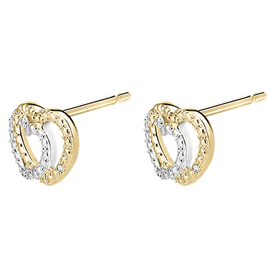 This pair of earrings, duo of hearts in white gold and yellow gold worked like diamonds and encrusted with diamonds inspires tenderness and complicity.