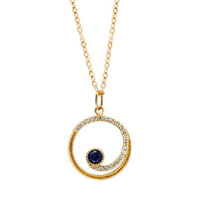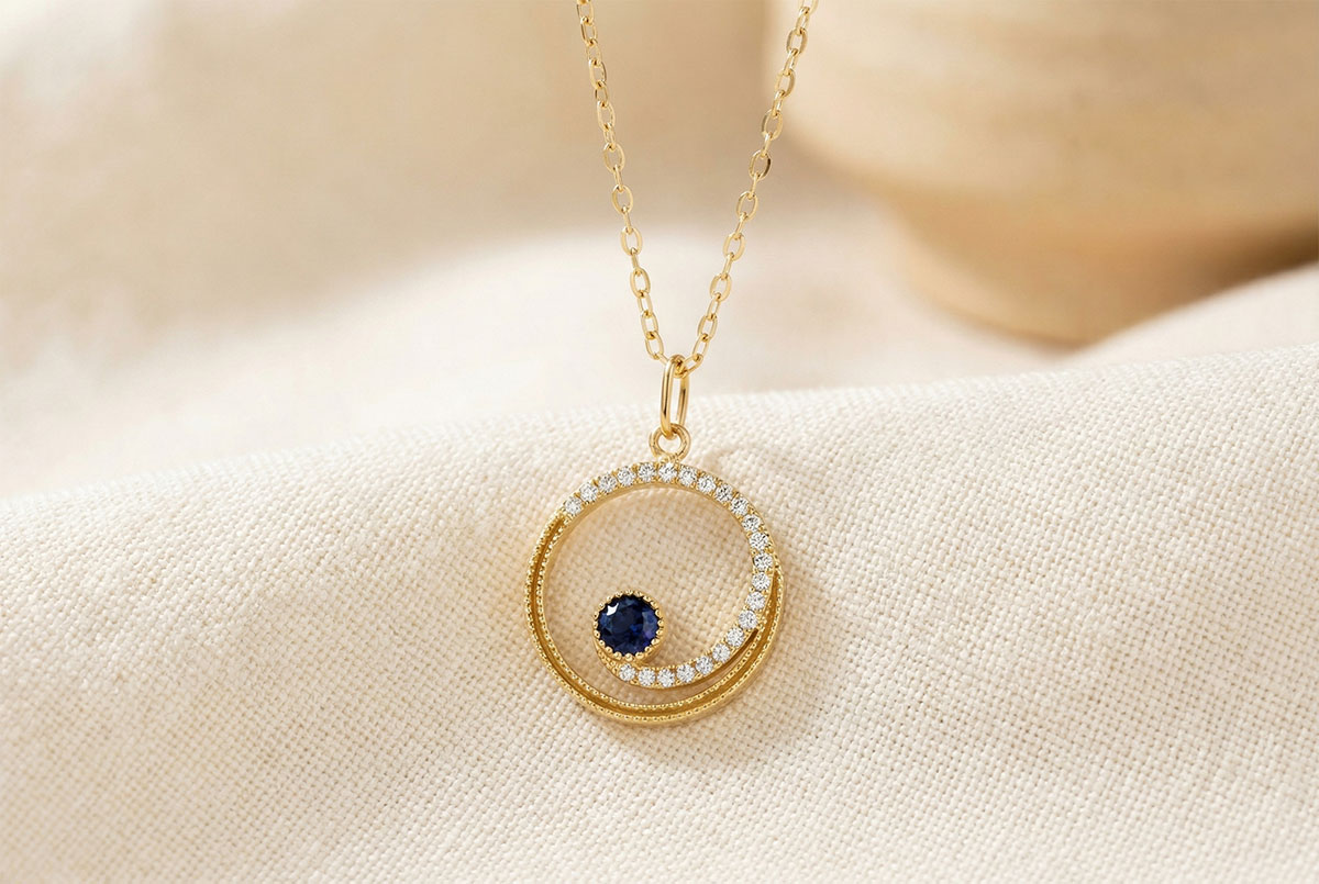 A deep blue sapphire lies at the heart of a circle set with 23 sparkling lab-grown diamonds.An elegant and captivating piece, where light traces the orbit of a midnight gleam.