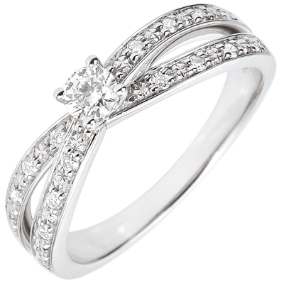 A pair of curves in white gold and diamond-encrusted carries a sublime solitaire to heaven.