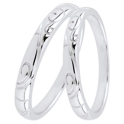 An elegant pair of wedding bands distinguished by the delicate swirls and arabesques of gold. This timeless duo showcases exceptional craftsmanship, perfect for celebrating your unique bond. White gold (18K Gold = 750/-): 0 g.More dimensions