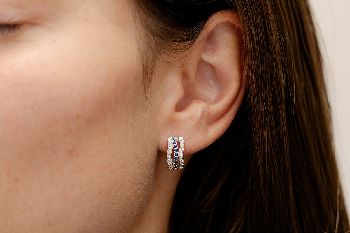 A double wave of diamonds framing a wave of sapphires. Feminine creole, combining the classic look with originality.