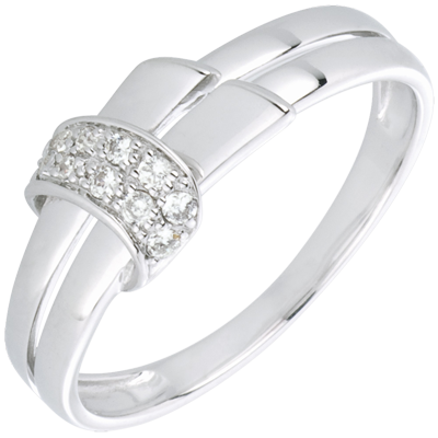 A split shank ribbon of white gold is encircled by a white gold ring paved with brilliant cut diamonds.