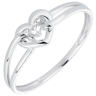 A diamond nestled in a delicate little heart on a white gold split shank ring. 1 diamond : 0.03 carat - White gold (18K Gold = 750/1000): 1.15 g.