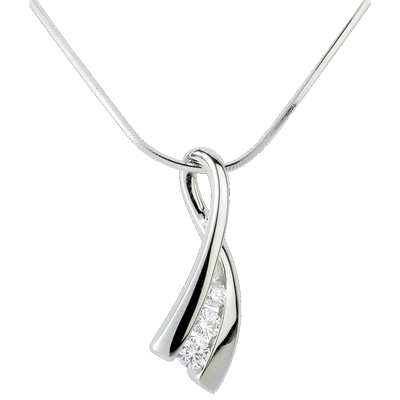 A ribbon of white gold hangs from a chain to give the illusion of a knot containing a trilogy of diamonds.